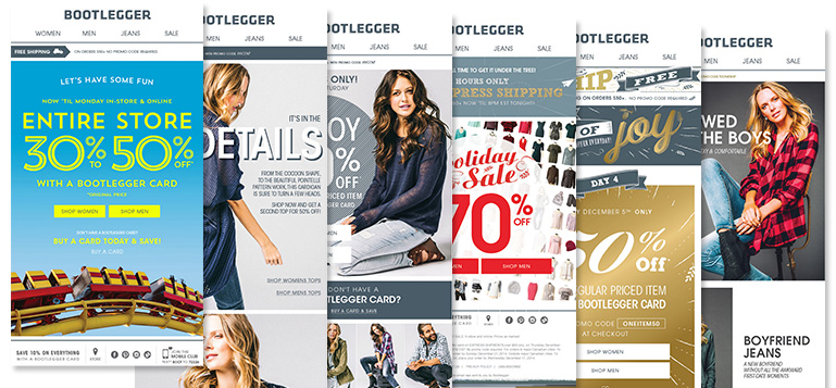 From 2014 to 2015, I worked at the Bootlegger corporate office on the Bootlegger e-commerce website. I was part of the team responsible for email design, development and deployment, as well as web design, front-end development, prototype development, user experience and content management for the Bootlegger website.